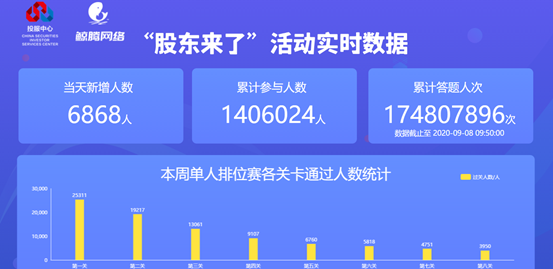 中证网讯(记者 周松林)投服中心9月8日消息,《股东来了》2020投资者权益知识竞赛自2020年8月10日正式上线,目前注册参赛人数突破100万,达140万;累计答题人次超1亿,达到1.7亿,双双创造历史新高。